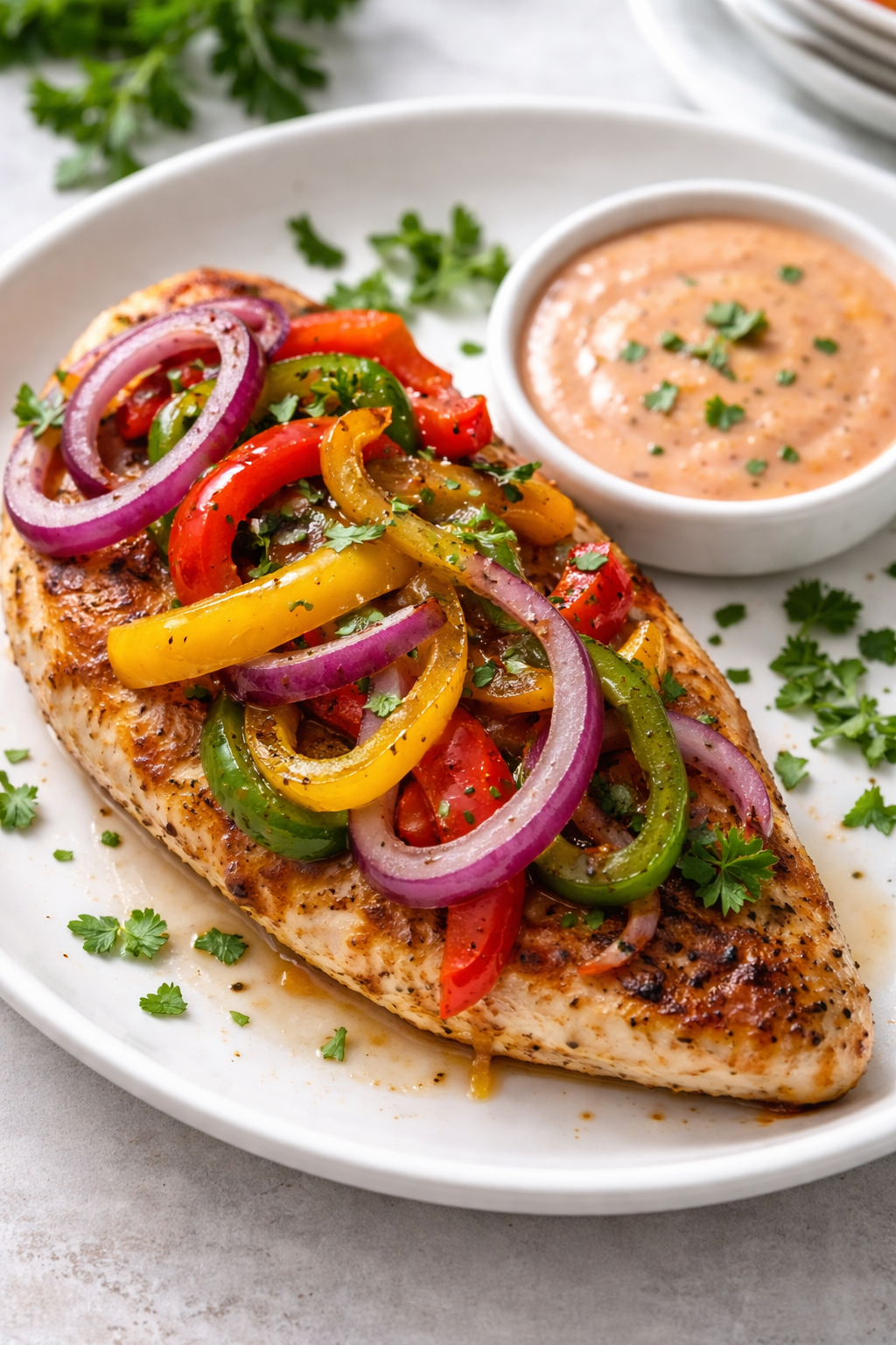 - Top the cooked chicken breast with the sautéed peppers and onions. Garnish with chopped parsley.