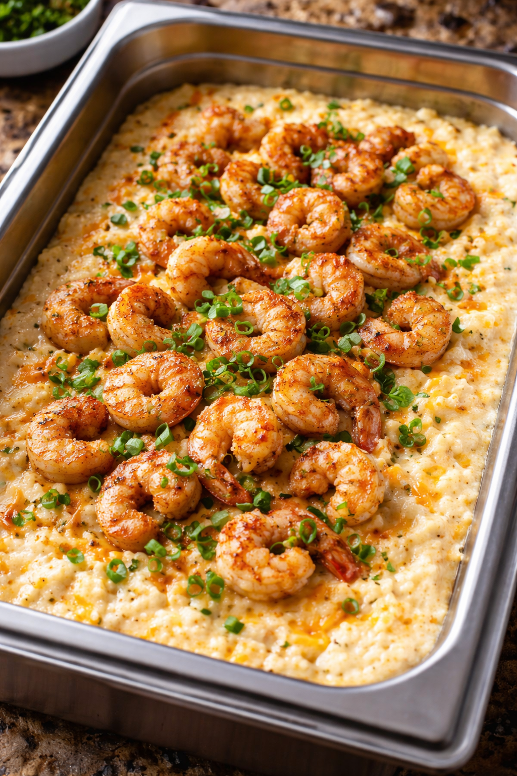 - Transfer grits to a serving dish and top with shrimp and green onions.