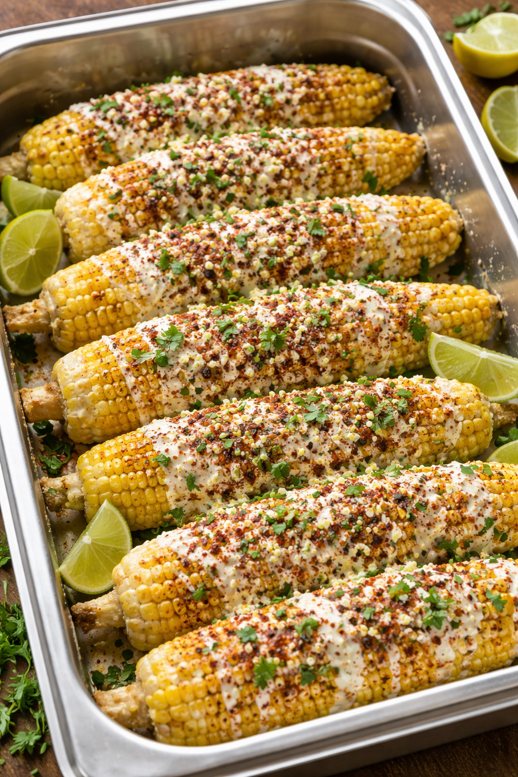 - Place cobs onto a large baking sheet. Spray with half of the lime juice, then season with half of the spice blend.